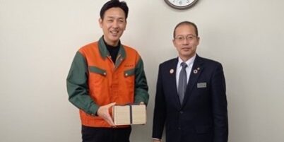 さつま町長上野俊市様(左)と米倉勝治社長(右)